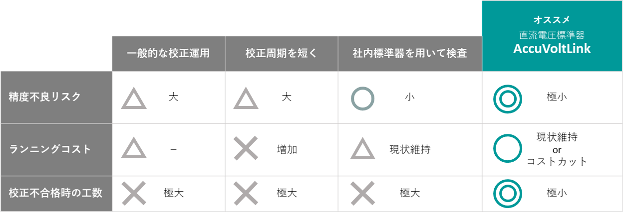そのAccuVoltLinkを社内標準器にすることにより社内計測設備も定期校正での校正不合格を防ぐことができます。
